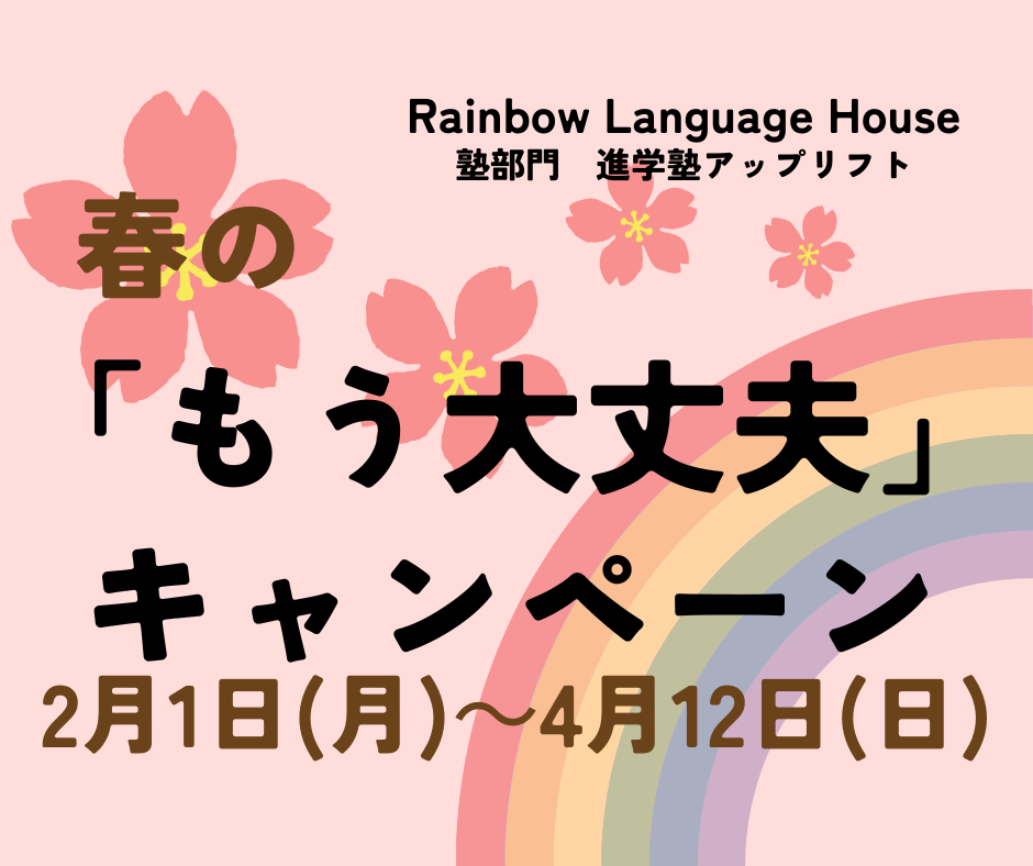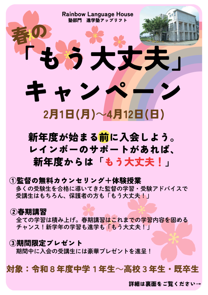 30Jan2026 春の「もう大丈夫」キャンペーン 「もう大丈夫キャンペーン」は塾部門・進学塾アップリフトが2月1日から令和8年度中高生を対象に実施する春の入会キャンペーンです。 入塾をお考えの皆さん、今のうちに入会して新年度を万全の態勢で迎えましょう。もう心配いりません。新年度は大丈夫! キャンペーン詳細は画像をご覧ください。 Tweet Share Hatena Pocket RSS feedly Pin it 単語くんと語彙力アップ! 最近のお知らせ一覧お知らせ一覧 単語くんと語彙力アップ! 2026.01.22 いよいよ受験シーズン! 2026.01.16 年末年始休業のお知らせ 2025.12.23 クリスマスウィークがはじまりました 2025.12.17 館内見学ウィーク開催! 2025.12.11